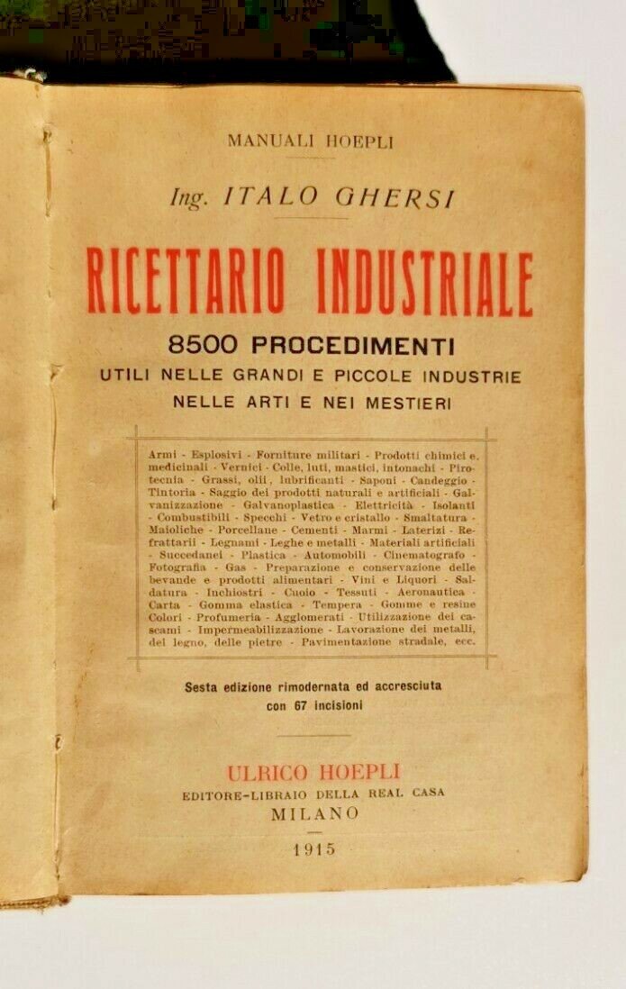 RICETTARIO INDUSTRIALE di Italo Ghersi 8500 procedimenti 1915 Hoepli libro