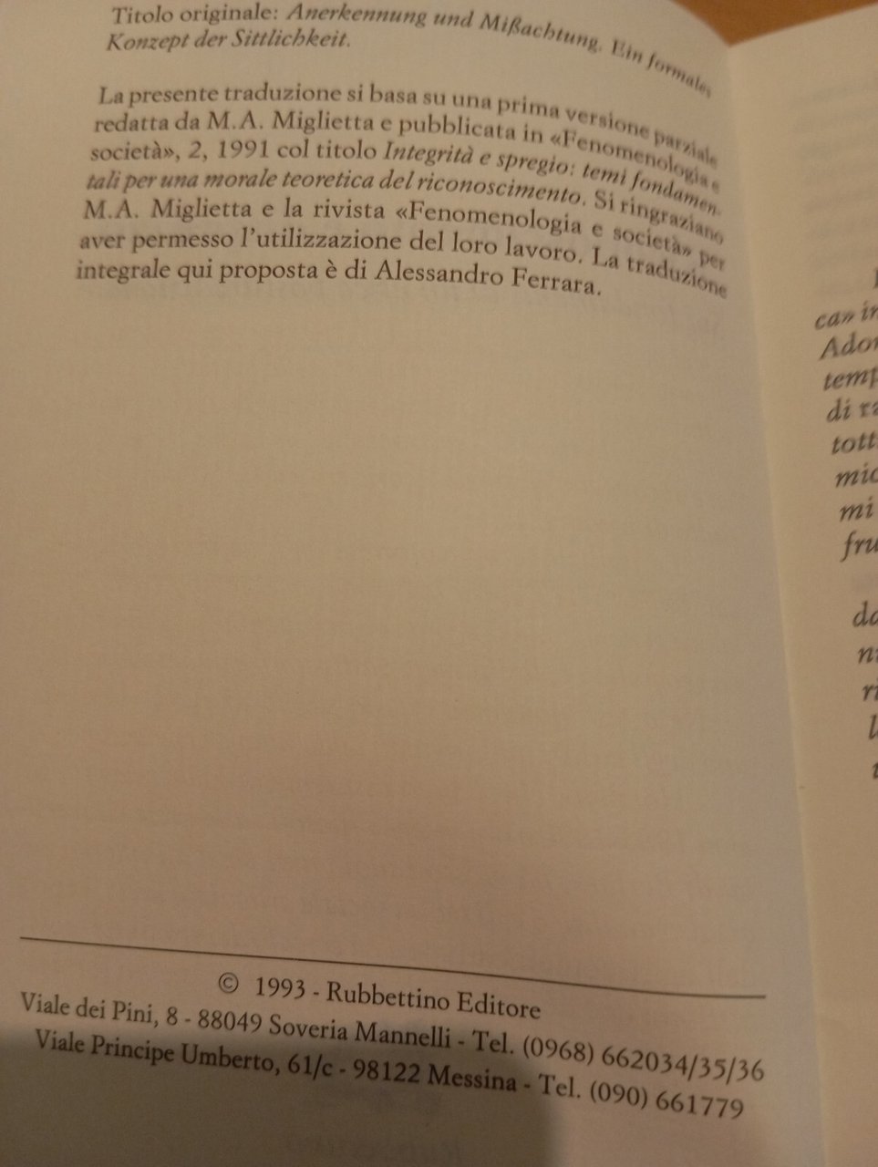 Riconoscimento e disprezzo, Axel Honneth, Rubettino, 1993