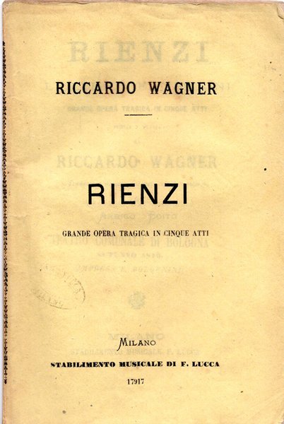 Libretto d’opera. Teatro Comunale di Bologna, Autunno 1876. Elenco dei personaggi completo dei nomi degli interpreti tra cui Adelina Garbini e Felice Pozzo. Wagner assistette alla prima a Bologna del suo “Rienzi” il 4 Dicembre 1876 ed era diventato cittadino onorario dopo il grande successo della sua “Musica dell’Avvenire”.