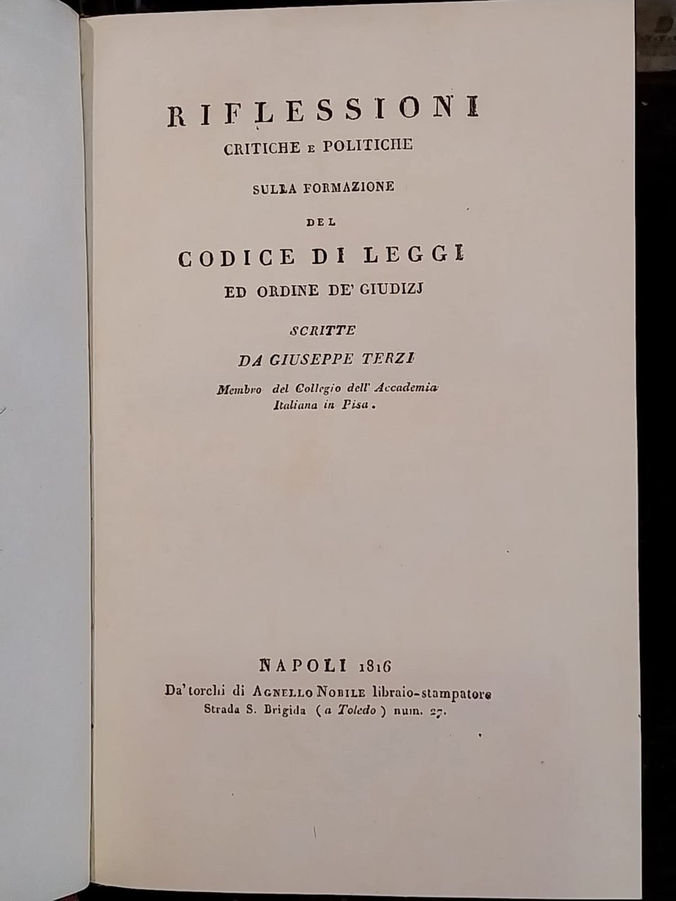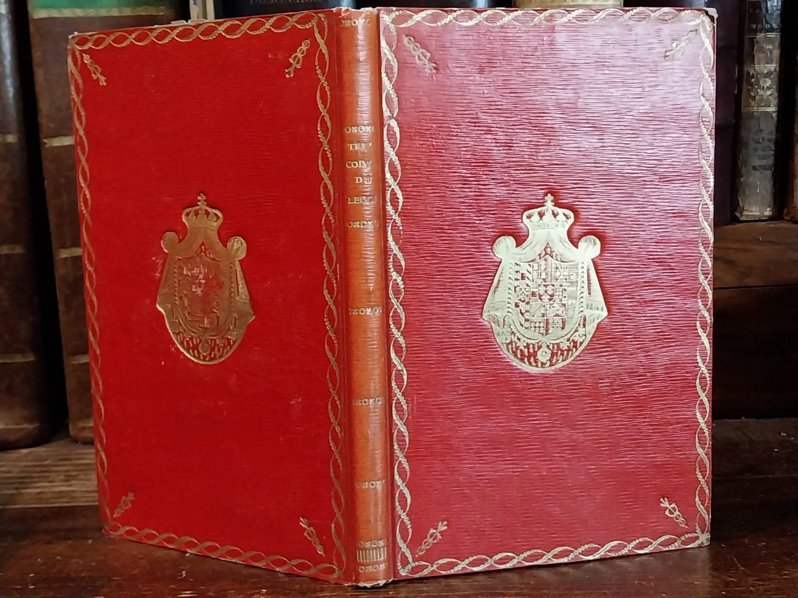In-8° (21 x 14 cm.), pp. 57, (2), bella ed elegante legatura in pelle zigrinata, dorso liscio con titolo e fregi in oro, ai piatti cornice intrecciata a motivi floreali, agli angoli un caduceo ed in centro grande arma Borbonica del Regno delle Due Sicilie, il tutto impresso in oro.