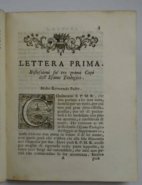 Cm. 21, pp. (8) 220 (20). Testate ed eleganti capolettera. Solida legatura coeva in piena pergamena rigida, dorso a nervi con titoli e fregi in oro. Eccellente stato di conservazione. Non comune.