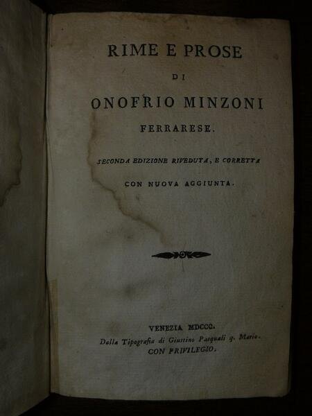 In-8°, pp. 94,51, legatura in mezza pelle muta. Gora di umidità alle prime 30 carte e alle ultime carte. MINZONI, Onofrio. – Figlio di Antonio e Livia Fenati, entrambi originari di Bagnacavallo (presso Ravenna), nacque il 25 genn. 1734 a Ferrara, dove, dopo aver svolto studi letterari, teologici, filosofici e matematici presso i gesuiti, venne ordinato sacerdote dall’arcivescovo M. Crescenzi nel 1759. Divenuto ben presto un apprezzato predicatore, fu richiesto dal Senato di Venezia e vi si trasferì, attendendo al tempo stesso all’insegnamento della filosofia, nonché all’approfondimento della matematica, come attestano, fra i suoi manoscritti, le risposte a quesiti in materia da lui inviate alle accademie di Londra e Parigi. Al termine dell’incarico presso il Senato, che alimentò la stima del doge Paolo Renier nei sui confronti, il M. lasciò Venezia, dopo aver rifiutato la carica di canonico penitenziere della basilica di S. Marco, preferendo, pare, non stabilirsi fuori Ferrara.Assecondando la richiesta dell’editore A. Pepoli, il M., benché sessantenne e interamente dedito agli impegni ecclesiastici, acconsentì alla pubblicazione delle sue Rime e prose (Venezia 1794) composte diversi anni prima, rivelando il talento letterario coltivato fin dalla gioventù. Il positivo riscontro della raccolta, prevalentemente poetica, fu immediato, come attestano le numerose edizioni che nel successivo decennio, a Firenze, Pavia, Pisa, Parma e Ferrara, fecero seguito a quella pepoliana. Nel 1811, sempre a Ferrara, l’opera fu riedita e ampliata per le cure dello stesso M., che affermava nella prefazione di aver da lungo tempo abbandonato la versificazione e di non essersi mai considerato un poeta di professione. La raccolta comprende sessantatre sonetti, il più noto dei quali è quello Per la morte di Cristo, composto all’età di ventisette anni e molto apprezzato da V. Monti che vi si ispirò per i suoi sonetti Sulla morte di Giuda (1788). Figurano inoltre la canzonetta A Maria tenente sulle braccia il Bambino, lo sciolto In lode di s. Luigi Gonzaga, il capitolo Per nozze, le traduzioni in versi martelliani di due cantici scritturali, nonché le prose poetiche Sugli occhi di Maria e Sopra la Croce. Benché estimatore della tradizione letteraria italiana, il M. non attribuì ai sonetti un contenuto amoroso, privilegiando i temi religiosi, da buon conoscitore delle Sacre Scritture che riteneva valida fonte di alta poesia. La sua produzione, caratterizzata da un tardo secentismo non privo di elementi di derivazione arcadica, poté godere, sul finire del Settecento, di una notorietà determinata principalmente dall’incondizionata ammirazione del giovane V. Monti. Questi, considerando il M. un maestro, gli indirizzò, fra l’altro, una delle lettere dedicatorie apposte al proprio Saggio di poesie (Livorno 1799), definendolo «un gran poeta» e influendo sulle posizioni di altri recensori. Uno di essi è F. Torti che concluse il suo Prospetto del Parnaso italiano (III, Perugia 1812, pp. 249-253) con un capitolo dedicato al M., dimostrandosene fermo sostenitore, anche a seguito di una lettera del 1793 nella quale Monti lo aveva esortato a non dimenticare i tre poeti danteschi: G. Parini, V. Alfieri e lo stesso Minzoni.