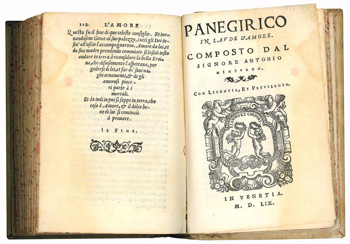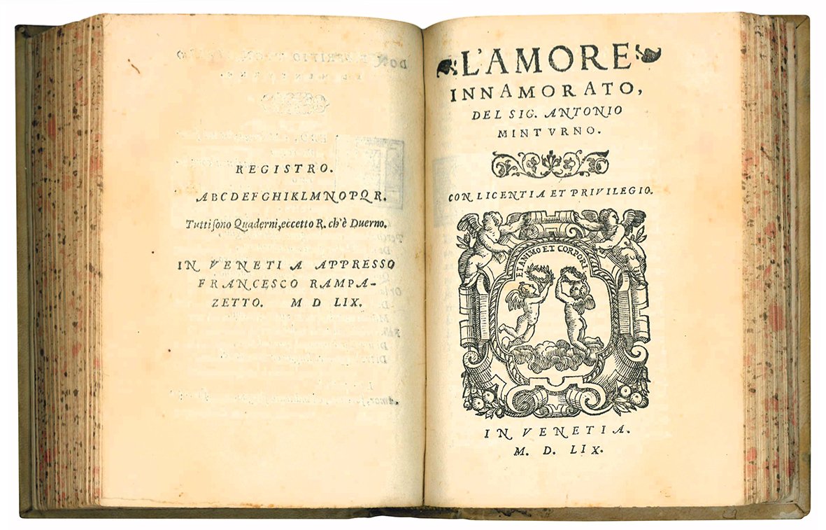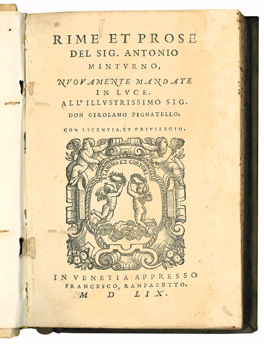 Rime et prose del sig. Antonio Minturno, nuovamente mandate in luce. All'illustrissimo Sig. Don Girolamo Pignatello. Venezia, Francesco Rampazetto, 1559. [Bound with:] L'amore innamorato [...] [followed by:] Panegirico in laude d'amore [...]