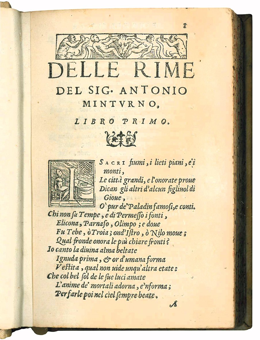 First edition of these three works by Minturno. The Rime, edited by Girolamo Ruscelli (1504-1566), marks a turning point in the history of southern Italian lyric poetry, as with its new experimental ‘Neapolitan' style it abandons the traditional Bembo and Petrarch model and sets a new style. With L'amore innamorato Minturno turns ideally to other models, notably Sannazaro's Arcadia and Boccaccio's Ameto, as he himself declares in his 1564 Arte poetica. The text, which narrates the adventures of Amore, son of Venus, is a prosimeter, that is, it alternates parts in prose with others in verse, and can be described as a kind of novel. The author imagines the tale as the result of the conversation among some nymphs in Sicily, engaged in discussing the topic of love. Along the same lines is also the Panegirico celebrating love.
