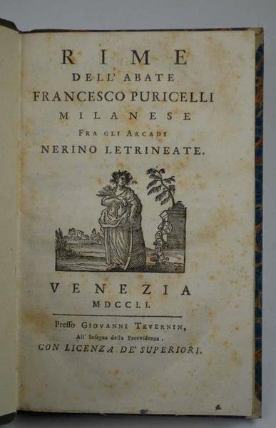 Cm. 17,5, pp. xl, 224. Vignetta al frontespizio. Solida ed elegante legatura ottocentesca in mezza pelle verde, dorso liscio con titoli e fregi romantici impressi in oro. Qualche arrossatura sparsa, peraltro ben conservato. Non comune.