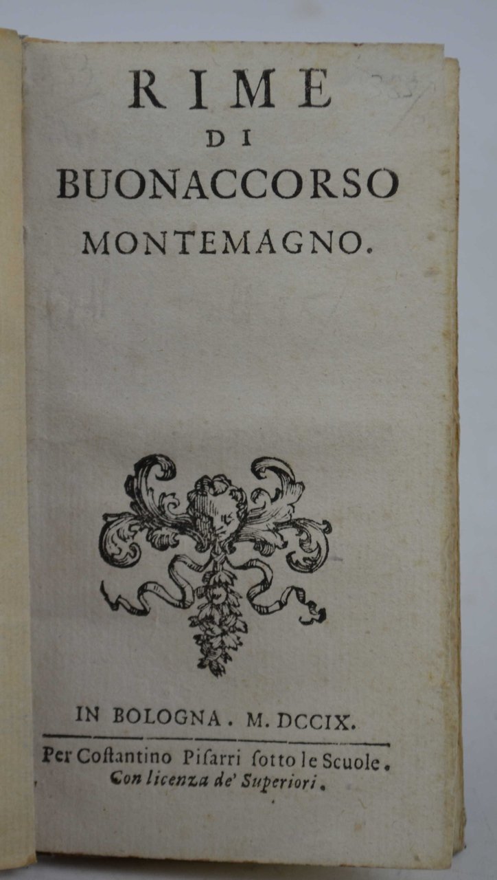 Cm. 13,5, pp. 47 (1). Fregio xilogr. al frontespizio. Leg. muta recente in carta marmorizzata. Esemplare ben conservato. Raccolte di rime del poeta italiano (1331 - 1390) da non confondersi con quelle del più noto nipote Buonaccorso da Montemagno il Giovane. Non comune edizione citata dal Gamba in nota (676).