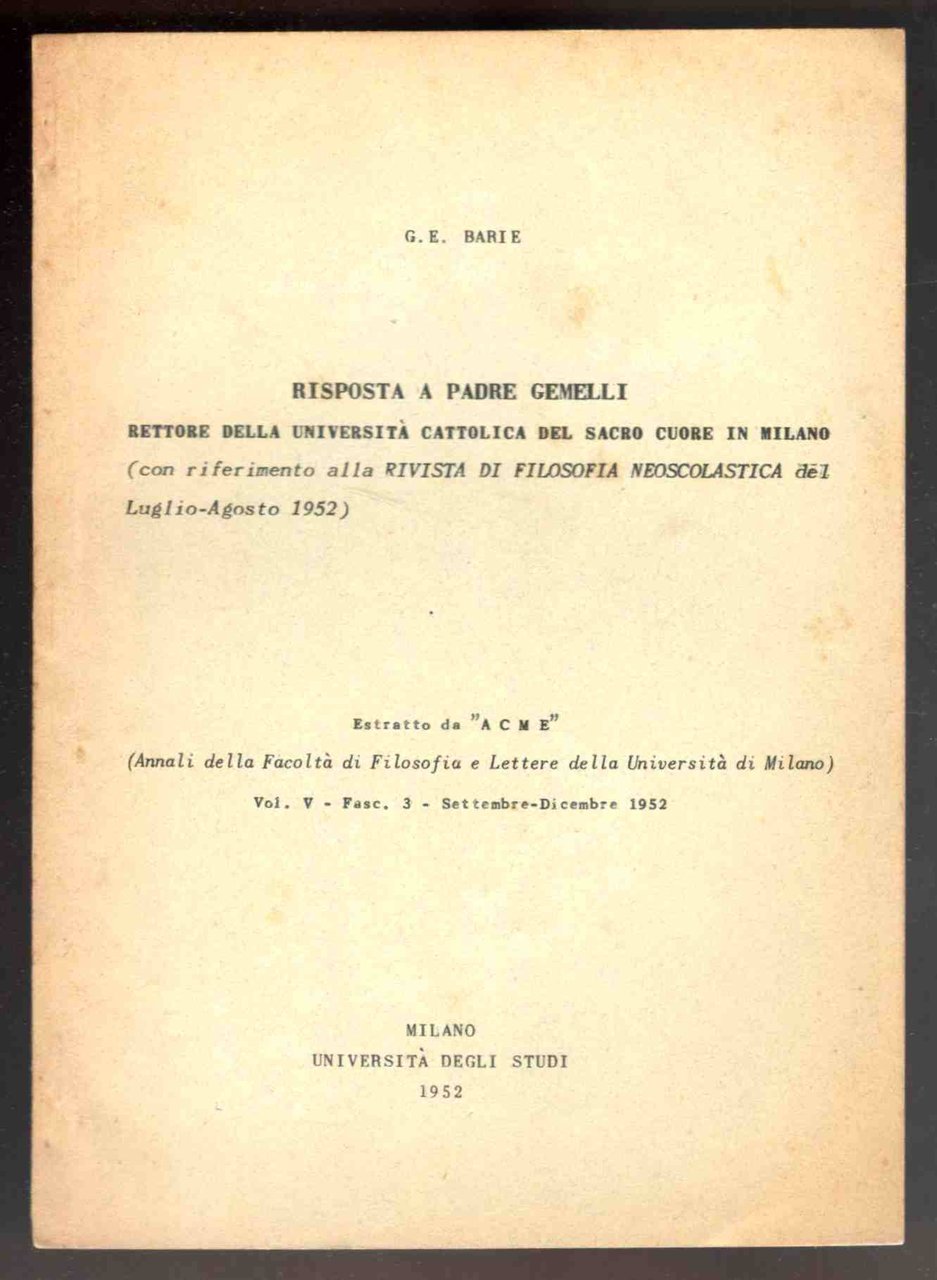 Risposta a padre Gemelli rettore della Università Cattolica del Sacro Cuore in Milano (con riferimento alla Rivista di filosofia neoscolastica del Luglio-Agosto 1952) | Libri antichi e moderni | Barié, Giovanni Emanuele