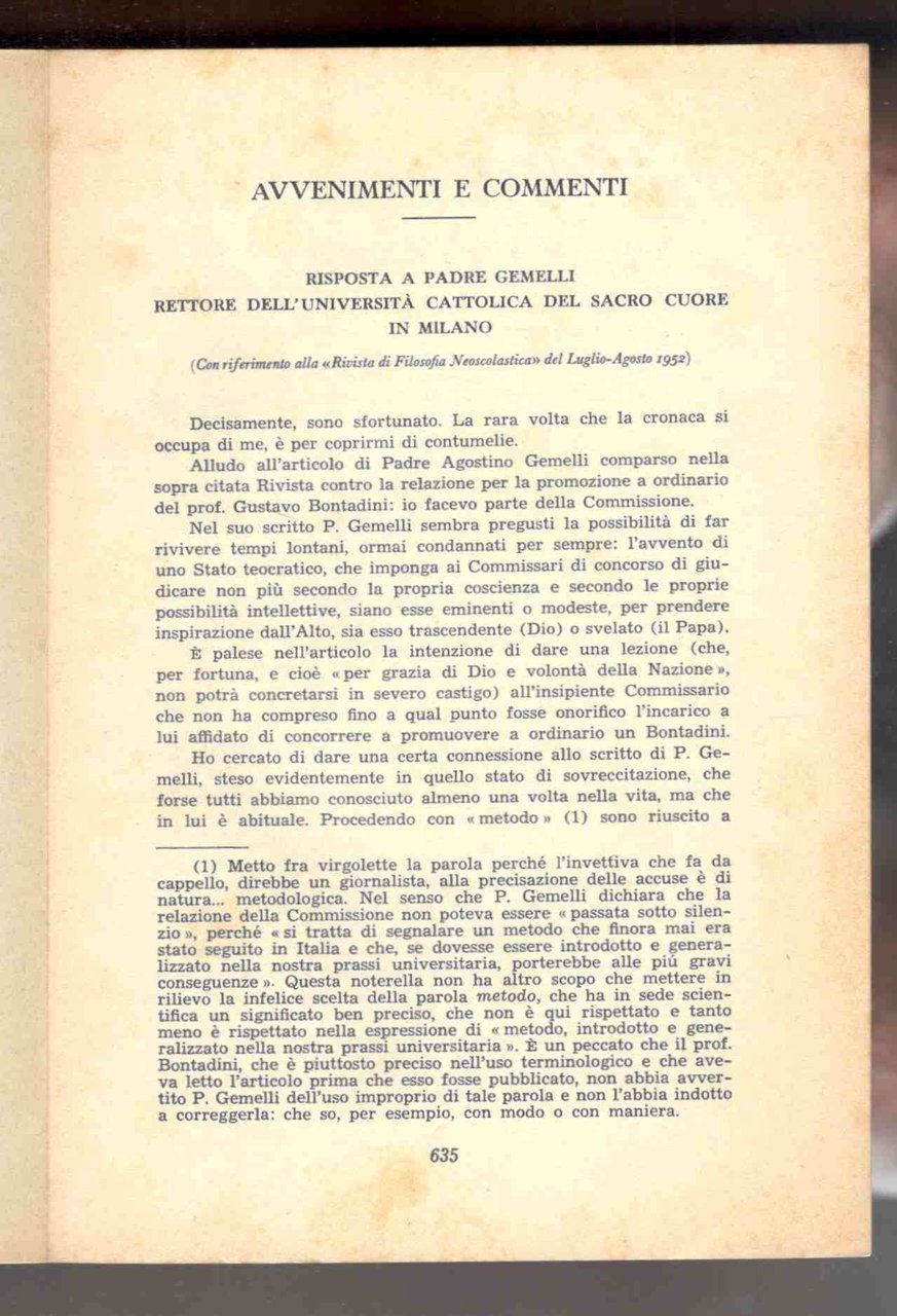 Risposta a padre Gemelli rettore della Università Cattolica del Sacro Cuore in Milano (con riferimento alla Rivista di filosofia neoscolastica del Luglio-Agosto 1952)