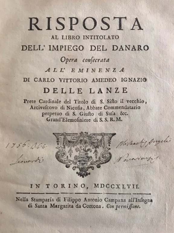 In-4° (cm. 21,5), legatura coeva in cartonato d'attesa (lievi usure), pp. [2] VIII 295 [1] in ottimo stato, con un'antica firma di appartenenza al frontespizio del letterato e storico novarese Michelangelo Leonardi (1756); una leggerissima brunitura uniforme e poche lievi fioriture. Edizione originale di un libro dedicato al card. Delle Lanze che critica Maffei e la sua dottrina economica. Cfr. Einaudi 698, Kress 254. Esemplare molto buono. (SD2)