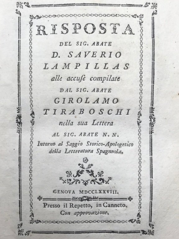 Risposta alle accuse compilate dal sig. abate Girolamo Tiraboschi nella sua lettera al sig. abate N.N. intorno al Saggio storico-apologetico della letteratura spagnola.