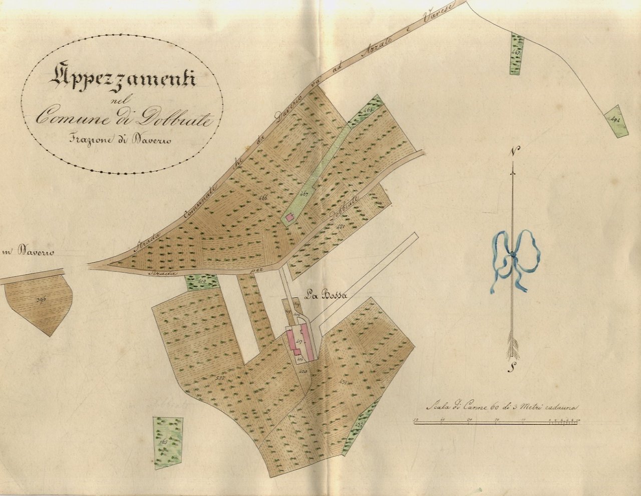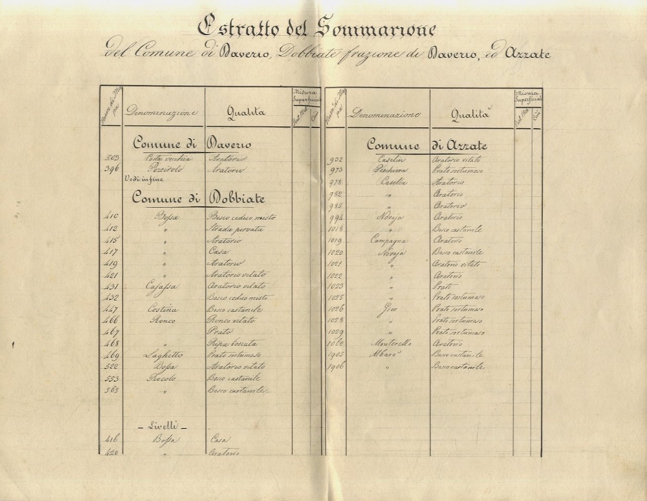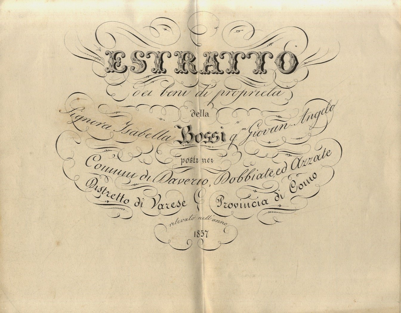 RISTRETTO dei beni di proprietà della Signora Isabella Bossi [.] posti nei comuni di Daverio, Dobbiate ed Azzate, Ristretto di varese, Provincia di Como. Rilevato nell'anno 1857.
