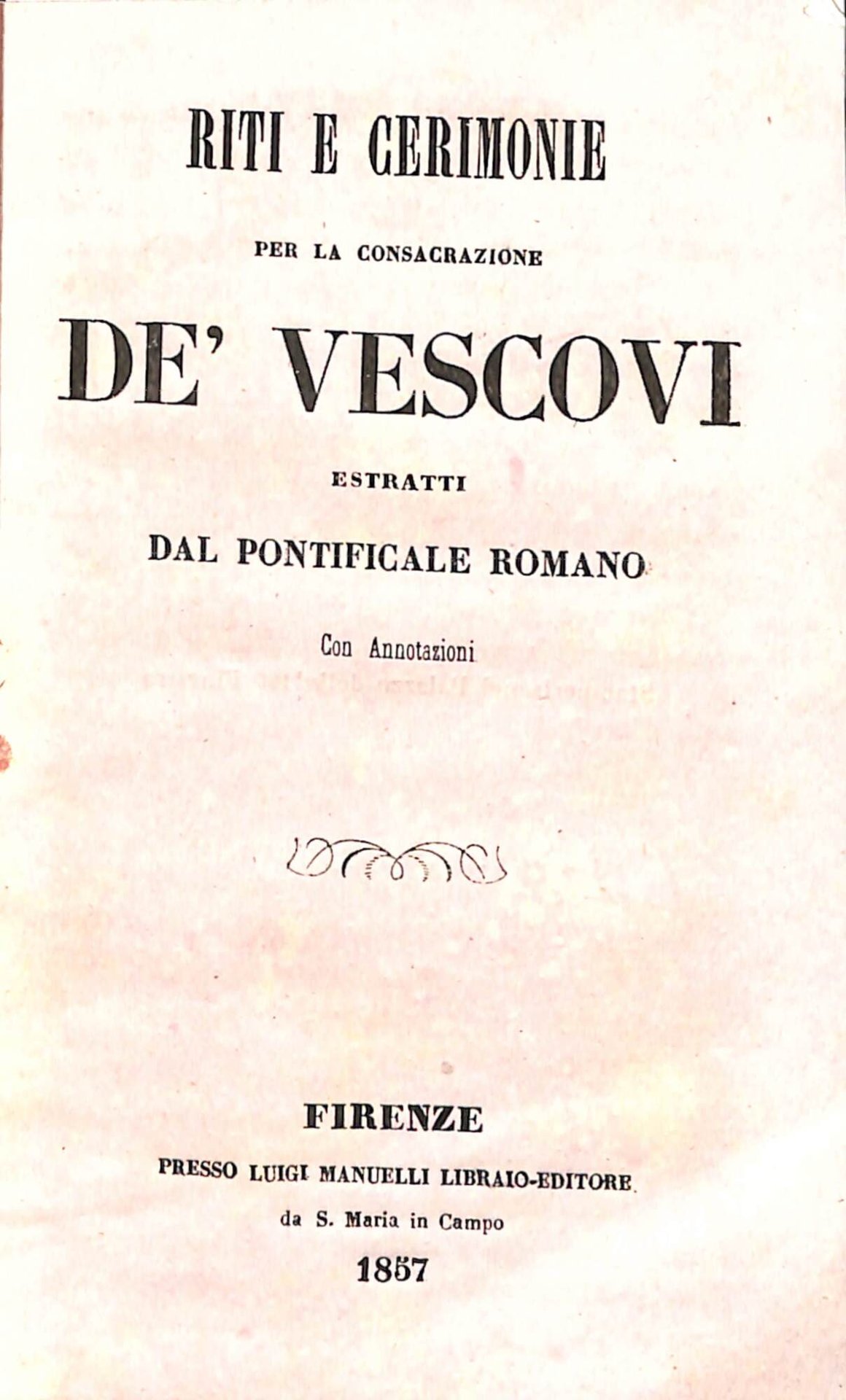 Riti e cerimonie per la consacrazione dei Vescovi estratti dal Pontificale romano, con annotazioni. 32 p. ; 17 cm. 200 - Ba Ottimo (Fine)