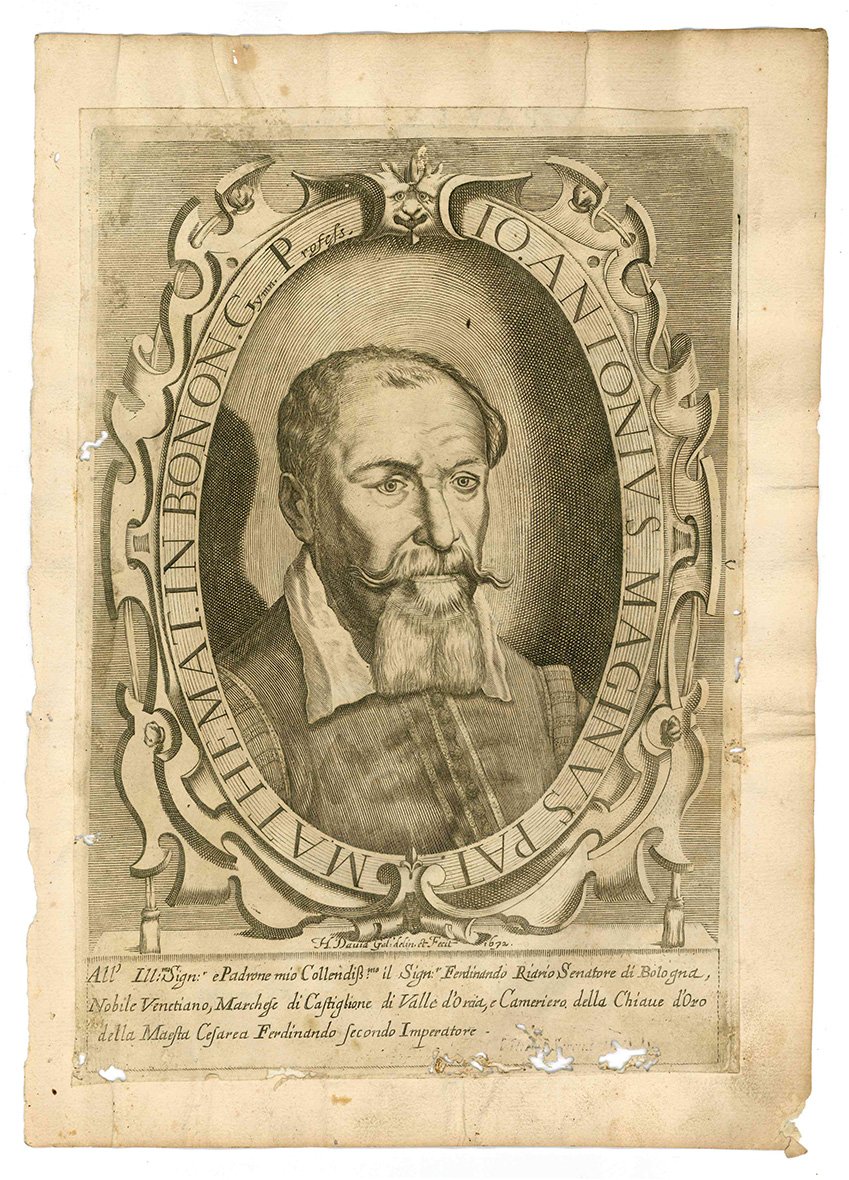 Bel ritratto calcografico (mm 305x208) dell'illustre astronomo, geografo e matematico Giovanni Antonio Magini, incollato anticamente su un foglio di carta pesante (mm 357x252). Segni di tarlo marginali che interessano solo minimamente l'iinciisione.