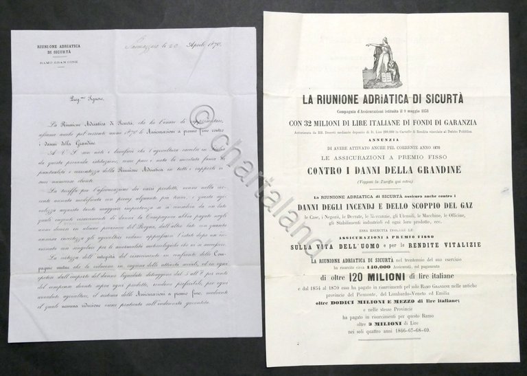 Riunione Adriatica di Sicurtà Ramo Grandine: Lettera e foglio informativo - 1870