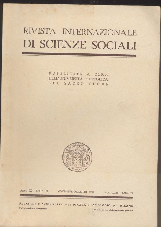 Rivista internazionale di scienze sociali pubblicata a cura dell'Università cattolica del Sacro Cuore - Annata 1952 completa da gennaio a dicembre in totale 6 fascicoli bimestrali