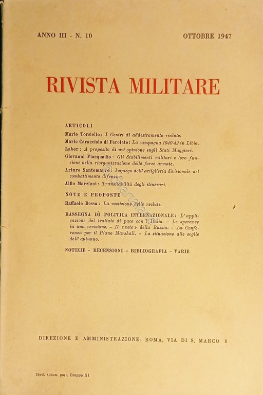 Rivista Militare - Anno III - N. 10 Ottobre 1947 Testo in lingua italiana. Pagine 100 ca. con illustrazioni e tavole. Copertina morbida. Condizioni molto buone.
