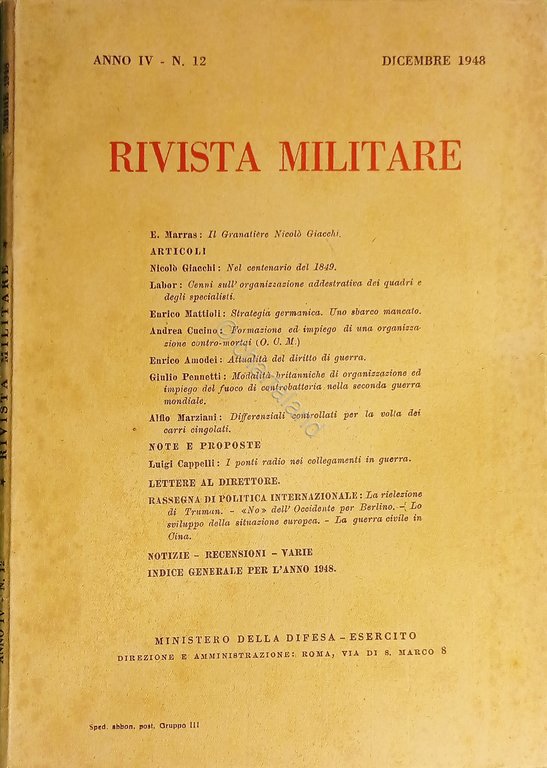 Rivista Militare - Anno IV - N. 12 Dicembre 1948 Testo in lingua italiana. Pagine 100 ca. con illustrazioni e tavole. Copertina morbida. Condizioni molto buone.