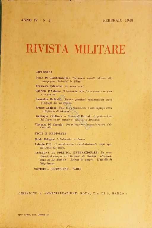 Rivista Militare - Anno IV - N. 2 Febbraio 1948 Testo in lingua italiana. Pagine 100 ca. con illustrazioni e tavole. Copertina morbida. Condizioni molto buone.