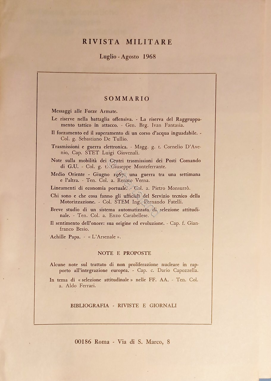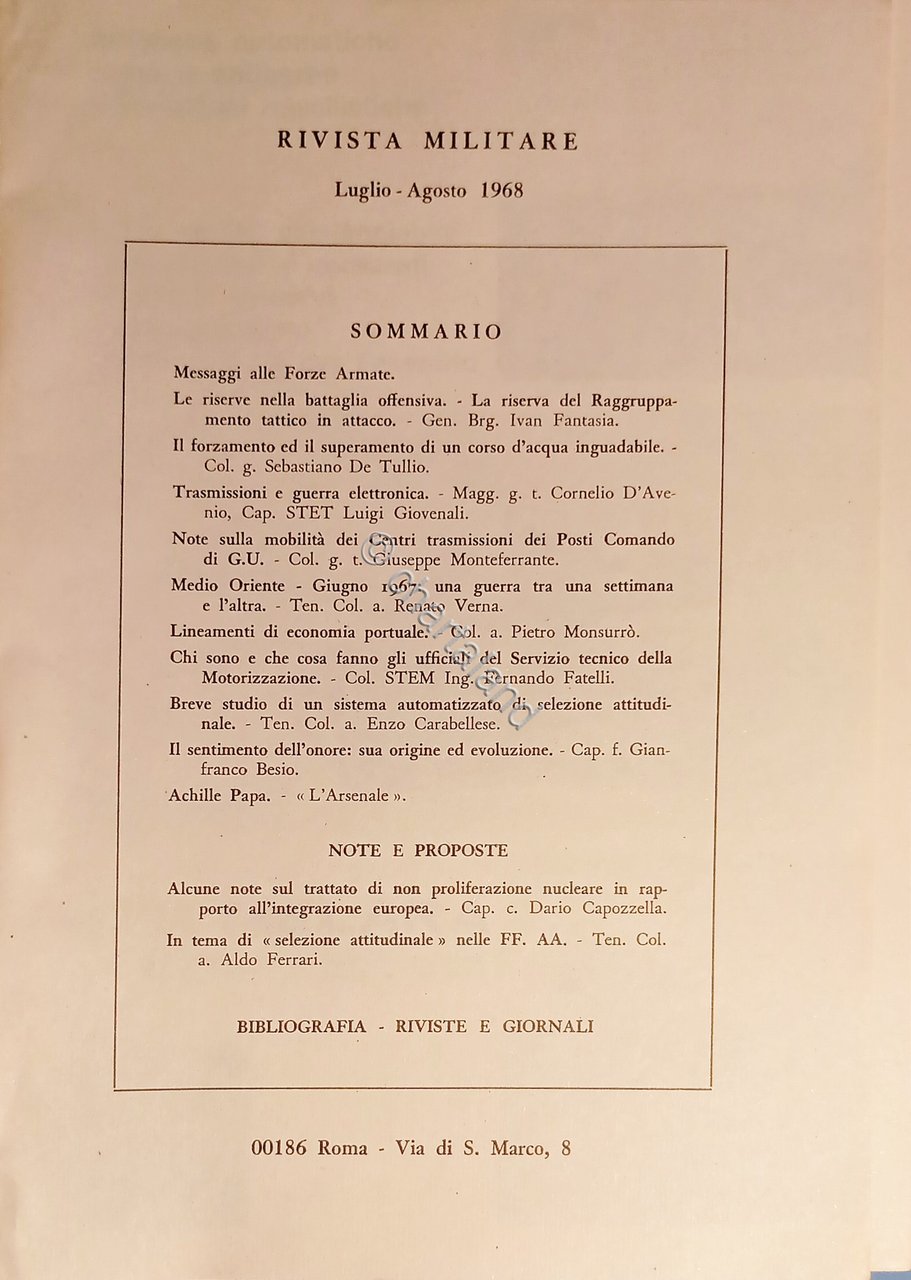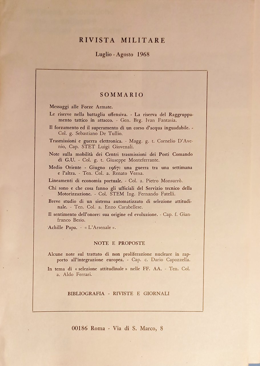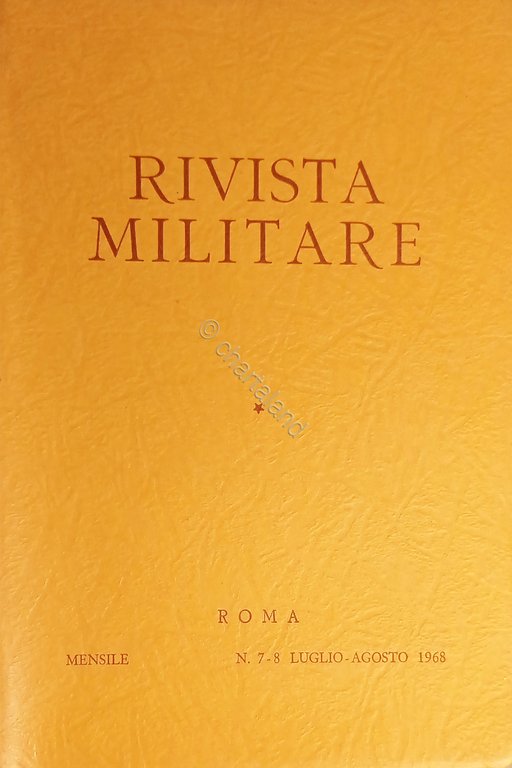 Rivista Militare - Anno XXIV - N. 7-8 Luglio - Agosto 1968 Testo in lingua italiana. Pagine 150 ca. con illustrazioni e tavole. Copertina morbida. Condizioni molto buone.