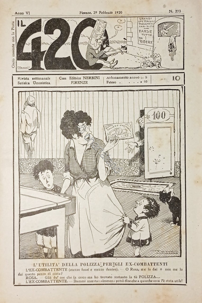 Rivista Satirica Umoristica - IL 420 - N. 273 - Anno VI - 1920 Testo in lingua italiana. Pag. 6 con illustrazioni Condizioni molto buone