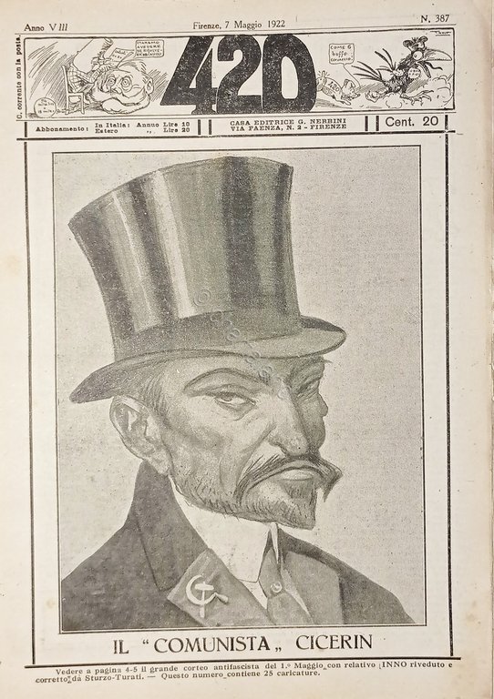 Rivista Satirica Umoristica - IL 420 - N. 387 - Anno VIII - 1922 Testo in lingua italiana. Pag. 6 con illustrazioni Condizioni molto buone