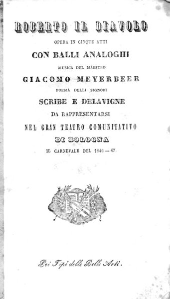 Libretto d’opera. Teatro Comunitativo di Bologna, Carnevale 1846-47. Elenco dei personaggi completo dei nomi degli interpreti tra cui Giuseppina Rosetti Sikerska e Ettore Marcucci.