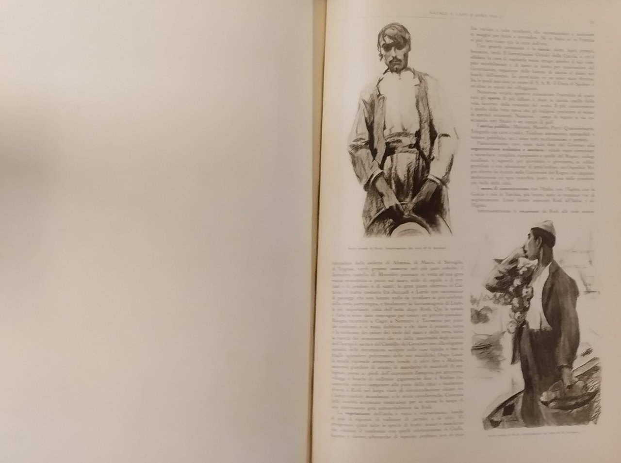 RODI E LE ISOLE ITALIANE DELL'EGEO Natale e Capodanno dell'Illustrazione italiana 1926 1927. Fratelli Treves Editori, 1927. 72 pagine, numerose illustrazioni in bianco e nero fuori testo, a colori dentro e fuori dal testo. Copertina editoriale in brossura illustrata da Guido Marussig. Stato di conservazione: buono (pagine ingiallite, fioriture, copertina sciupata con strappi ai margini e piccole mancanze) Libro usato saggistica