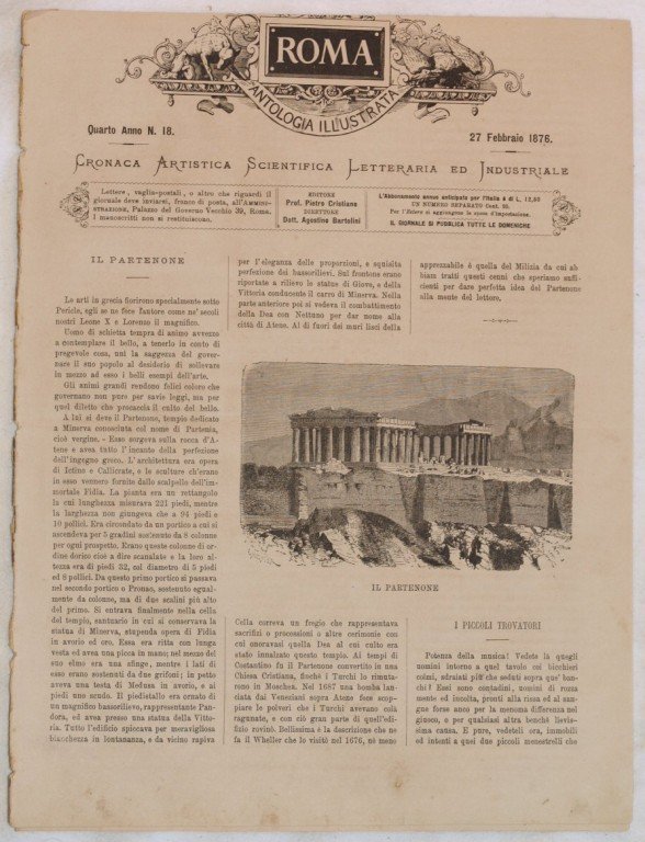 In 4. Dim. 32x24 cm. Pp. da 137 a 144. Numero del 27 Febbraio 1876 di Roma antologia illustrata, rivista settimanale di articoli scientifici, letterari ed industriale. All'interno alcune incisioni tra cui il Partenone, i trovatori, il Padiglione Turgot al Palazzo del Louvre. Tra gli articoli trattati: le rovine di San Renato ed il Padiglione Turgot. Brossura editoriale in buone condizioni generali. Legatura assente. All'interno le pagine si presentano in ottime condizioni con rare fioriture. Number of the 27 of February 1876 of Roma antologia illustrata, weekly review of scientific, litterary and industrial articles. Inside some engravings among them the Partenone, the troubadours, the Palace Turgot in the Louvre. Among the issues treated the ruins of Saint Steven and the Palace Turgot. Editorial cover in good general conditions. Binding is missing. Inside pages are in very good conditions with occasional foxings.