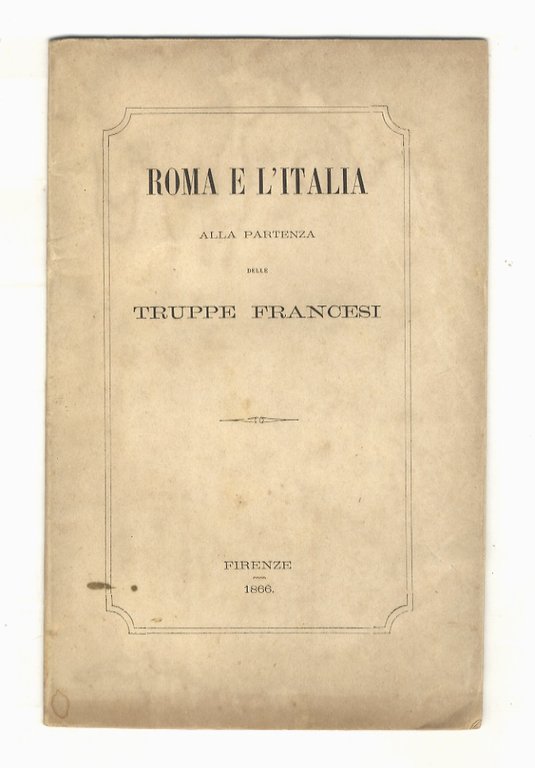 Firenze, Tipografia del Giglio (Via Pandolfini N. 24), 1866, in-8, br. editoriale, pp. 24. Dovuto alla penna d'un sacerdote progressista (Babbini fu curato della Cattedrale di Pistoia) questo opuscolo pèrora la fine dell'occupazione di Roma da parte delle truppe francesi, già stabilita (Convenzione del 15 settembre 1864) fra la Francia di Napoleone III e il Regno d'Italia. Ricordiamo che la Breccia di Porta Pia è del 1870; nè Pio IX né i suoi successori accettarono l'accaduto e la diatriba fra Stato e Santa Sede rimase aperta fino ai Patti Lateranensi del 1929. Ottime condizioni, intonso.