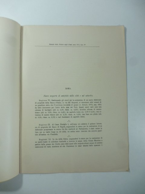 In 4, cm 22 x 29,5, pp. (8). Brossura muta. Notizie relative ai ritrovamenti nella Regione VI (scavi per la sede della banca d'Italia), IX, XI, XIII, XIV