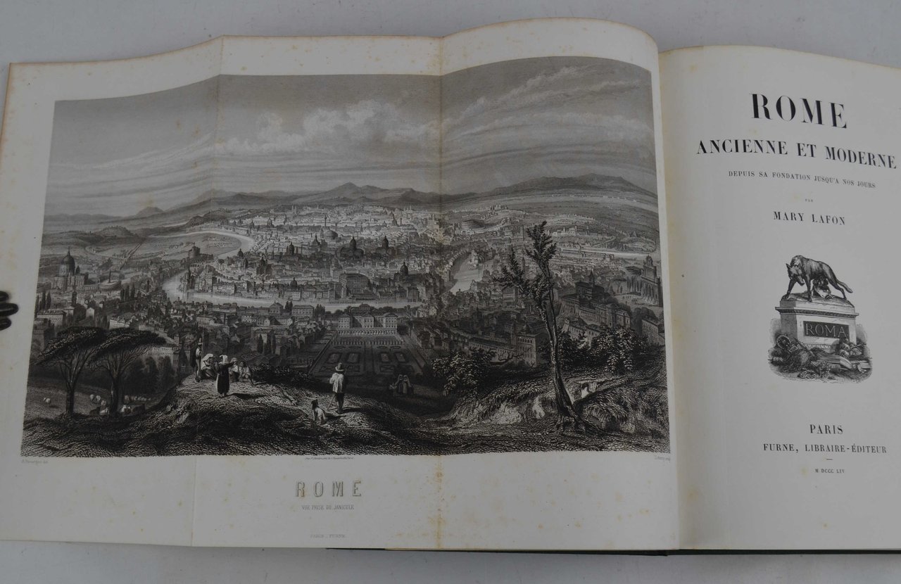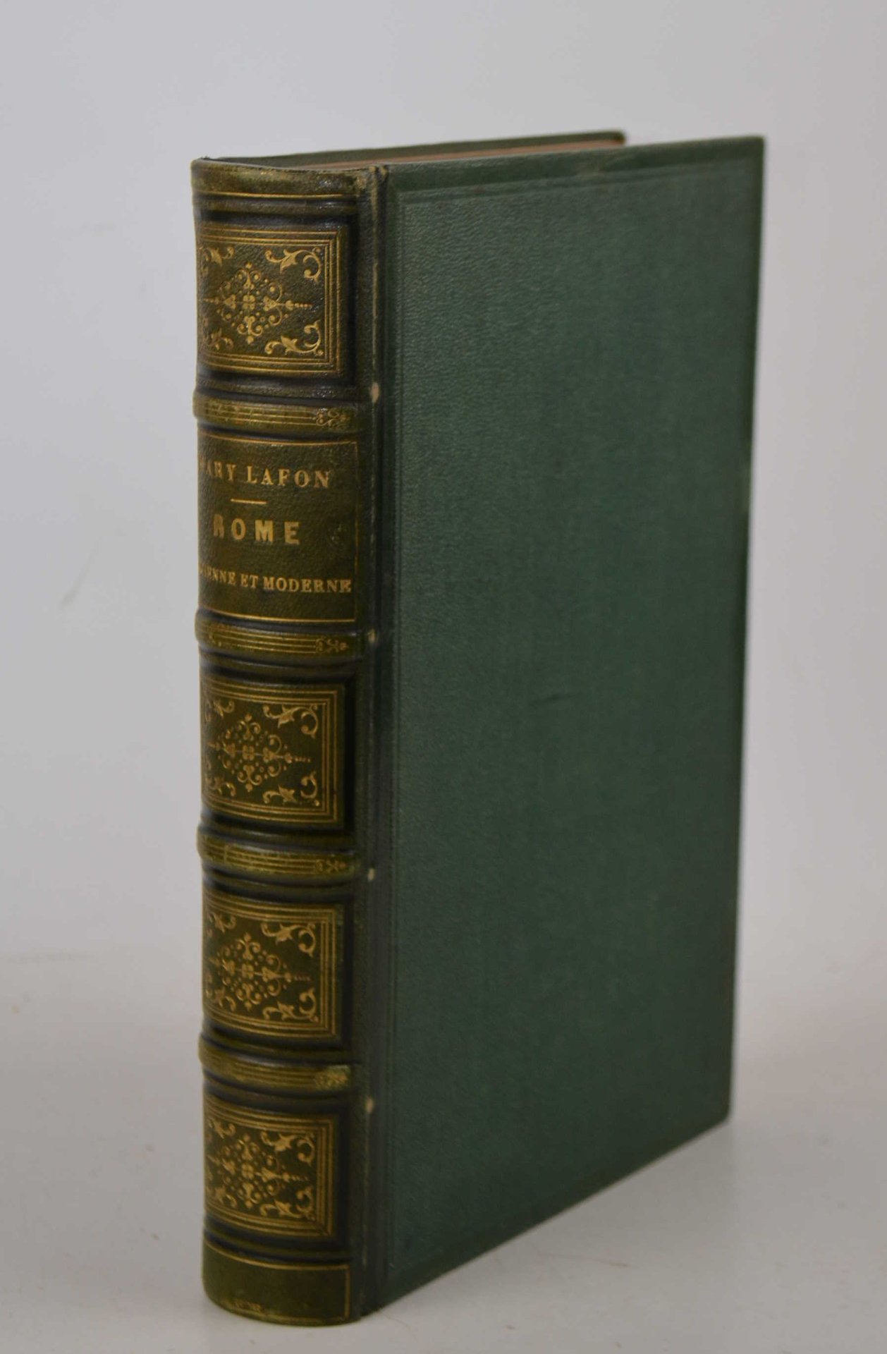 Cm. 26,5, pp. (4) 676. Con molte figure xilografiche nel testo e 26 tavole finemente incise su acciaio di cui 2 ripiegate (Roma vista dal nervi Gianicolo e la pianta della città). Bella leg. coeva in mezza pelle verde, dorso a con titoli in oro e fregi ai comparti. Tagli dorati. Bell'esemplare, particolarmente fresco con qualche sporadica fioritura. Opera di grande interesse con un apparato iconografico davvero rilevante.