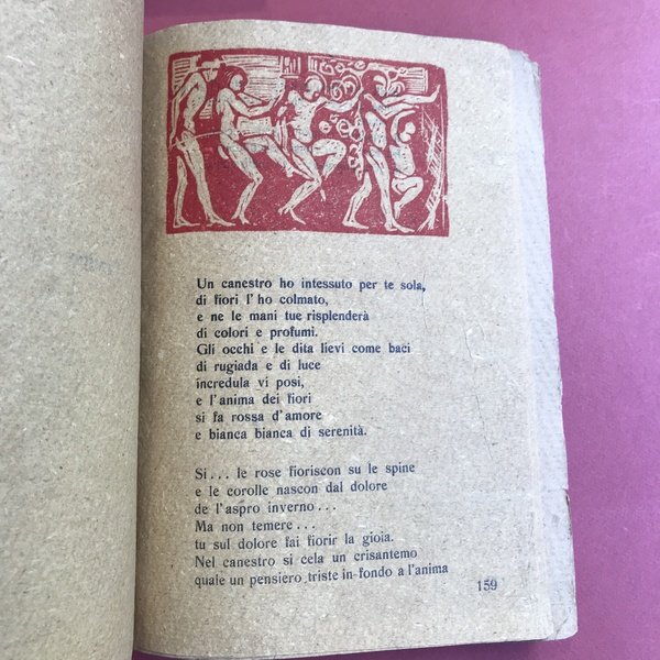In-8°, pp. 172, illustrazioni xilografiche in rosso, brossura editoriale. Piccoli strappi alla brossura e una mancanza alla brossura. Curiosa edizione stampata su carta rustica giallina. Tiratura di mille esemplari numerati, il nostro è il n. 122.