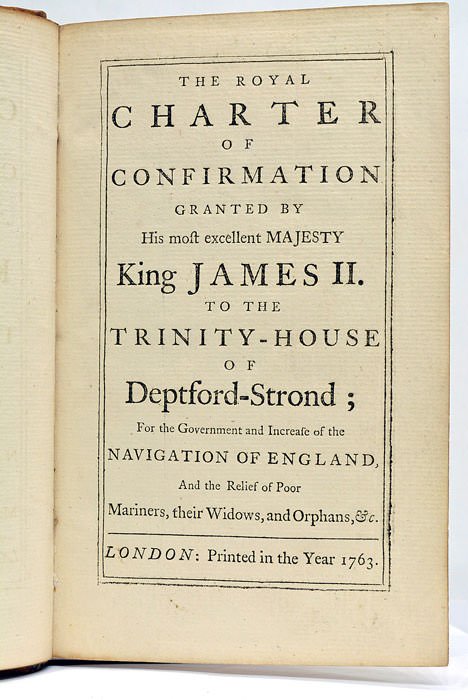 ROYAL CHARTER (The) of Confirmation granted by his most excellent Majesty King James II to the Trinity-House of Deptford-Strond; for the Government and Increase of the Navigation of England, and the Relief of Poor Mariners, their Widows, and Orphans, etc.