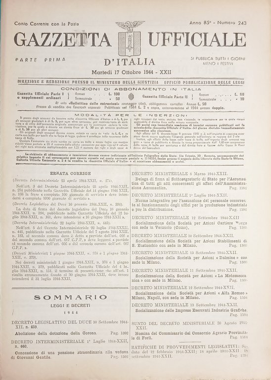 RSI Gazzetta Ufficiale d'Italia N. 243 - 1944