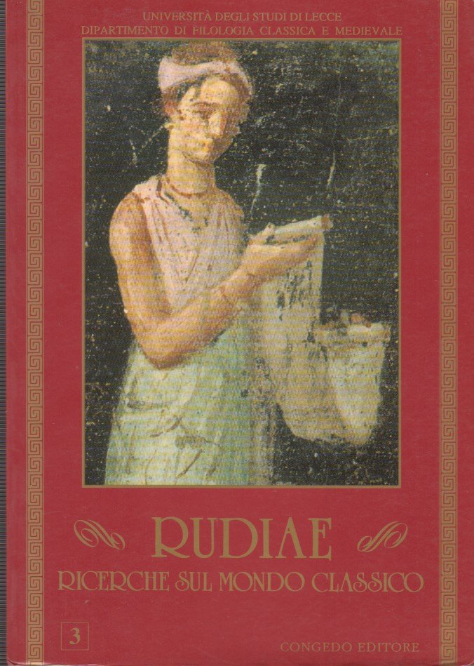 In-8 (Cm 24 x 17), pp. 184, brossura editoriale illustrata, XI tavole bianco nero fuori testo. Collana Università degli studi di Lecce dipartimento di Filologia classica e medievale Rudiae, 3. Normali segni del tempo. MOLTO BUONO - Indice: Mario Capasso-Fulvio De Salvia: Faiyum 1990: prospettive di ricerca papirologica ed archeologica - Mario Capasso: Epicarmo nei papiri ercolnaesi - Mario Capasso: Problemi di conservazione, restauro e svolgimento di papiri carbonizzati II - Mario Capasso: Considerazioni bibliologiche a proposito di Phibet 110 II 61-64 - Maria Antonietta Cervellera: Seneca: La vita come metafora - Marinella Corsano: Il sogno di Eufemo e la fondazione di Cirene nelle Argonautiche di Apollonio Rodio - Mariacarla De Giorgi: Due frammenti notati di Euripide (P.Leid inv. 510, P. Vind. G. 2315) - Dora Liuzzi: Maniliana II (Esegesi di alcuni passi controversi del l. II degli Astronomica) - Lucia Macini: Recenti studi sulla psicologia di Cicerone - Rosanna Sardiello: Il Giuliano Imperatore di Lorenzo de' Medici alla luce degli scritti dell'Apostata - Didattica del greco nelle scuole secondarie