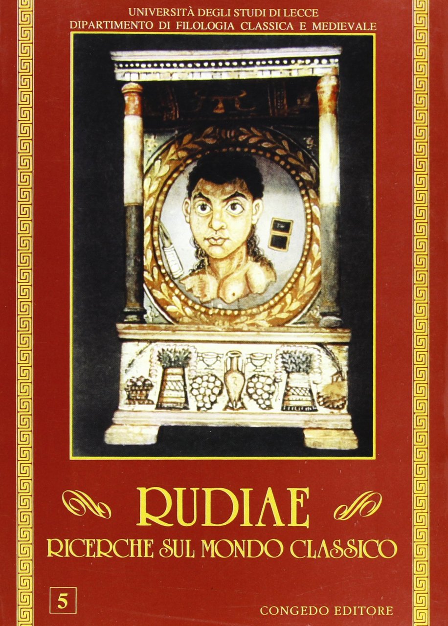 In-8 (Cm 24 x 17), pp. 186, brossura editoriale illustrata. Collana Università degli studi di Lecce dipartimento di Filologia classica emedievale Rudiae, 5. OTTIMO - Indice: Ottorino Specchia: Nosside - Francesa Angiò: Simplegadi e Stretto di Messina in Apollonio Rodio e n ella vita di Tauro (Dalla vita di S. Pancrazio di Taormina) - Robert Campagner: Metafore agricole in Pindaro - Mario Capasso: Per la storia della Pairologia ercolanese I - Mario Capasso: L'instrumentum Scriptorium in un ritratto conservato al Museo Egizio del Cairo - Rosalba Dimundo: Il confronto d'amore denza remedium: Hor. C. 1,33 - Dora Liuzzu, Maniliana IV (esegesi di alcuni passi controversi del l.IV degli Astronomica) - Carlo Prato: Note al testo di Giuliano Imperatore - Enrico Renna: Il frammento 171 Wimmer di Teofrasto nei Cesari di Giuliano Imperatore - Rosanna Sardiello: La raffigurazione di Costantino nei Cesari di Giuliano Iperatore (3356 B) - Valerio Ugenti: Notarella esegetica a Giuliano (ad. Matr. deor. 6) - Valerio Ugenti: Tertulliano, Giuliano e l'insegnamento delle lettere classiche - Onofrio Vox, Crono epicureo (Luc. Sat. 7) - Onofrio Vox, Due note all'Epodo XVII di Orazio .