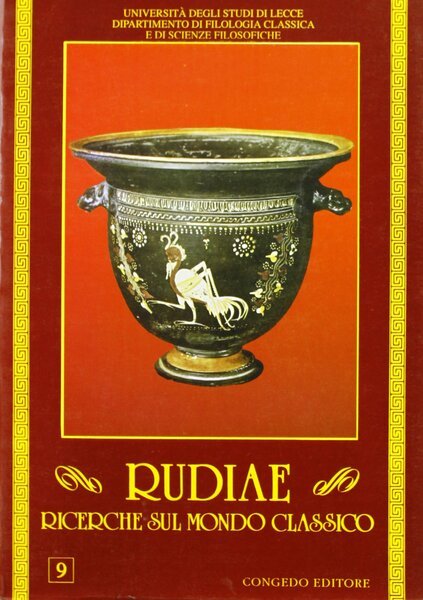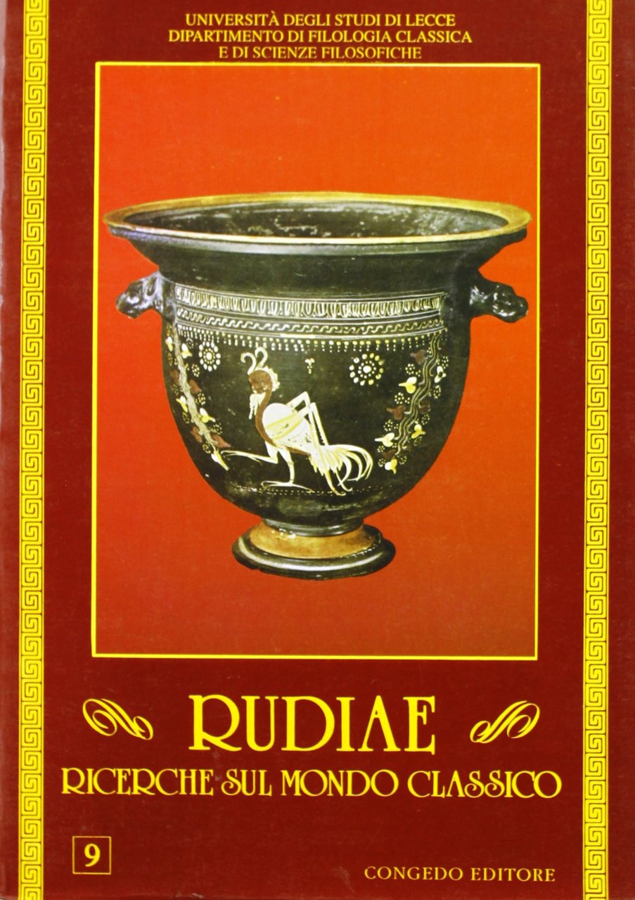 In-8 (Cm 24 x 17), pp. 388, brossura editoriale illustrata. Collana Università degli studi di Lecce dipartimento di Filologia classica e scienze filosofiche, sezione di filologia classica, Rudiae, 9. COME NUOVO - Indice: Anna Angeli: Filosofia e retorica nella polemica antiaristotelica di Epicuro (Philod. Rhet. VIII coll. 41,12 Liv 17 Sudhaus II pp. 57-59) - Concetta Aprile: A proposito dell'estremo pudore, in figure maschili e femminili - Giancarlo Bessi: La figura di Clitemestra e il problema del male in PS. Plut. De Homero 213 - Luisa Brattico: Per un indice tematico di Ekphraseis greche (II-IV sec.) - Pamela Calogiuri: Il mal di testa nel Corpus Hippocraticum - Mario Capasso: Rileggendo il PBakchias 89 = PFayyum 204 (Ippocrate, aforismi I 1-2) - Mariafrancesca Giuliani: Il Glossario Ippocratico di Galeno - Cristina Grasso: Erratum ertullianeum in CChL 1: Ad martyras 4,5 - Rosanna Guido: Alcune considerazioni sulla figura del yeitwv nelle Commedie di Menandro - Dora Liuzzi: Note al l II dell'edizione maniliana della Lorenzo Valla - Pier Angelo Perotti: La presenza di Ottaviano nell'Eneide: Una messa a punto - Carlo prato: Annotazioni linguistiche e filologiche al testo delle Tesmoforiazuse - Rosanna Sardiello: Gli dei bianchi e neri. A proposito di Plin. NatHist 2,5(7) 17 - Rosanna Sardiello: I Giardini di Adone di Costantino: Iul Caes 239 c-d - Rosanna Sardiello: Il marco Aurelio di Giuliano Imperatore - Valerio Ugenti: Le desinenze -erimus / -eritas e il genitivo pronominale -ius nelle clausole metriche tertullianee - Sabrina Vissicchio: Le metafore pindariche relative ad ambiti musicali - Onofrio Fox. Note alle immagini di Filostrato Flavio