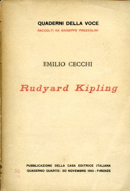 In-16° grande, pp. 75, (5), brossura editoriale. Ritratto fotografico di Kipling f.t. Ottimo stato. Prima edizione di questo giovanile studio critico di Cecchi, uno dei suoi primissimi libri, sul grande scrittore inglese. Il volume uscì editorialmente senza frontespizio. 'Il saggio su Kipling uscì sulla Voce (1º dic. 1910) e poi, subito dopo, nei Quaderni della Voce (n. 4, 1911). In una nota del febbraio del '12 (Taccuini, p. 22) scriveva: 'Il saggio su Kipling, determinato in me da quella crisi oggettiva e di realismo morale che attraversai quando cominciai ad uscire dagli anni penosi della mia vita sola e data a occupazioni non congeniali.; l'incontro con la figura letteraria di Kipling fu casuale. Si trova, anche esso, sulla linea dell'Inno; come una degenerazione, starei per dire materialistica delle idee e dei sentimenti che l'Inno rappresentava'. Le qualità dello scrittore, ancora entusiasta di fronte alle 'scoperte', prevalsero al punto di fare di una monografia una sorta di rievocazione appassionata della personalità e del cursus di Kipling sullo sfondo di una natura esotica inquietante. Renato Serra rimase impressionato dal saggio, tanto da scriverne al Cecchi '.ho letto con gran piacere. Kipling, lo scrittore che io amo tanto da non volerne parlare. Ma questa volta me ne parlano così bene: il suo giudizio critico coincide con l'impressione del lettore innamorato. E tutto il ritratto è semplice, fluido, ricco.' (24 genn. 1911, in Epistolario, Firenze 1953).' (Felice Del Beccaro in D.B.I., XXIII, 1979). Quaderni della Voce raccolti da Giuseppe Prezzolini. Quaderno quarto. Simonetti, Le edizioni della 'Voce', n. 51.