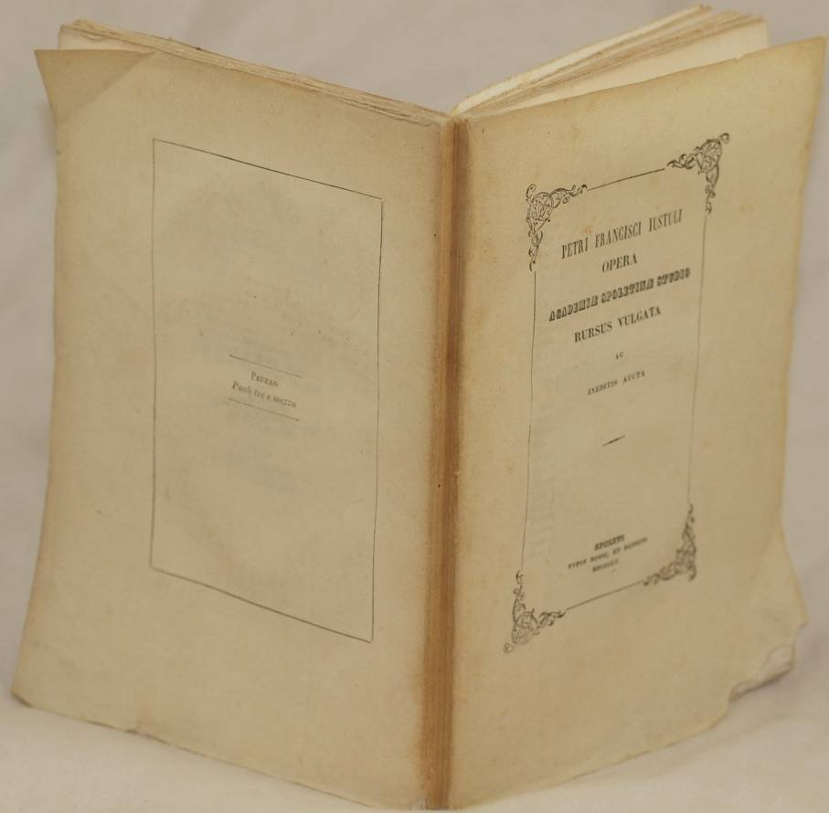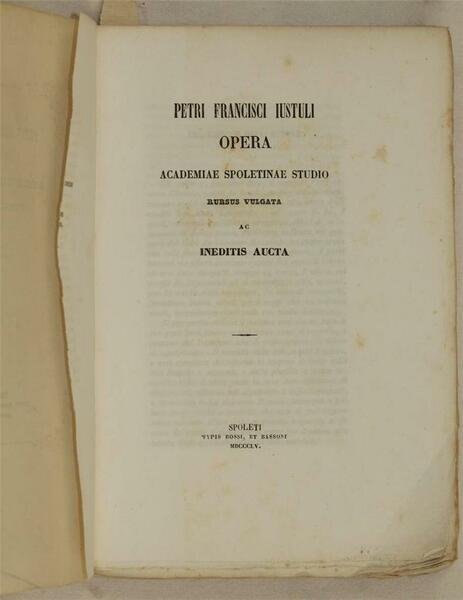 In 8. Dim. 23,5x15,5 cm. Pp. VIII+167+(5). Rarissima opera, l'unica ristampa del 1855 dell'opera "Rursus vulgata" ormai introvabile del poeta spoletino Pierfrancesco Giustolo. L'opera venne ristampata a cura dell'Accademia di Spoleto nel 1855, in quanto già allora l'edizione originale del 1510 risultava introvabile. Presente il testo con l'aggiunta di alcuni scritti inediti del poeta recuperati dall'archivio vaticano. Edizione molto rara, solo tre esemplari censiti su SBN. In buone condizioni generali In barbe. Brossura editoriale in buone condizioni generali con alcune parti mancanti. Legatura in buone condizioni. All'interno le pagine si presentano in buone condizioni con fioriture, ancora da tagliare. Piegatura all'angolo inferiore destro alle prime 88 pagine. Very scarce work, the only riedition of 1855 of the work "Rursus vulgata" now almost unfoundable of the poet from Spoleto Pierfrancesco Giustolo. The riedition was cared by the Accademia di Spoleto in 1855, because the original edition of 1510 was unfoundable. There is the original text with the adding of some inedit writing of the poet found in the Vatican archiveVery scarce edition. In good general conditions Uncut copy. Editorial cover in good general conditions with some missing parts. Binding in very good conditions. Inside pages are in good conditions with foxings, still to be cut. Folding in the right lower corner in the first 88 pages.