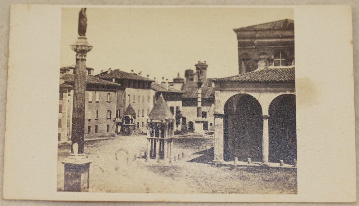 Foto originale all'albumina del 1865 circa che mostra San Domenico di Bologna.<BR>Al verso "Societa fotografica bolognese" studio fotografico attivi in via Alta bella n. 1624 (oggi n. 9) dal 1862 al 1866. La fotografia è applicata su cartoncino originale marchiato. Antica nota manoscritta che indica "S. Domenico". Dimensioni cartoncino: mm 105x61. Dimensioni foto: mm 72x57. In ottime condizioni. Original albumine photo of 1865 circa showing the view of San Domenico in Bologna.<BR>In the verso "Societa fotografica bolognese" photographers active in via Alta bella n. 1624 (today n. 9) from 1862 to 1866. The photo has been applied in an original marked carton paper. Ancient handwritten note indicating "S. Domenico". Size of page: mm 105x61. Size of the photo: mm 72x57. In very good conditions.