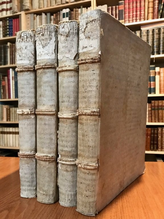 4 volumi in-folio (cm. 34,2), genuine legature coeve in piena pergamena (tratte da manoscritti più antichi) con nervi a vista e antiche etichette cartacee ai dorsi (segni d'usura), titolo anticamente manoscritto ai tagli inferiori; pp. [10] 618, [2] 327 [217], [2] 579 [1b], [2] 330 [2b] [240] in buono stato, con splendide e grandi vignette in rame ai frontespizi, dedica a Papa Paolo V con testatina silografica che lo ritrae nell'atto di ricevere un libro dall'autore inginocchiato; testo su due colonne; alone al primo e terzo tomo, alcune bruniture al secondo e quarto, segni d'uso. Prima edizione giuntina della scelta e del commento del Farinacci alle decisioni della Sacra Rota. Cfr. Sapori 2612 che cita la seconda edizione. L'illustre penalista morirà esattamente in quest'anno. Esemplare molto buono. (SK6)
