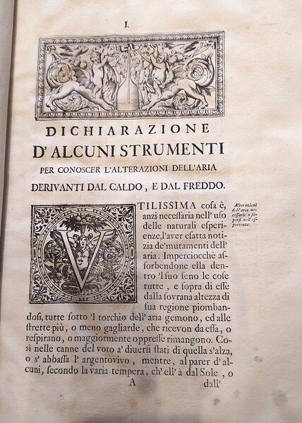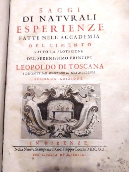 in Folio (cm. 36) bella legat. moderna in stile antico mezza pelle, nervi, impress. a secco e tit. oro al dorso, cc. 9 compreso il bel ritratto inciso del Granduca di Toscana Cosimo III, CCLXIX pp., 10 cc. con 75 tavole nel testo incise in rame a piena pagina,tit. a stampa rossa e nera con stemma dell'Accademia inc., testatine e finaletti inc. in rame, grandi iniz. xilogr. Seconda edizione (la prima fu pubbl. nel 1666), di questa importante opera in cui l'autore descrive centinaia di esperimenti scientifici fatti da questa accademia. Riccardi II, 407. Cinti 163. Piantanida 1665. Brunet, V-29. Es. con alcune arrossature di umidità al marg. bianco di alcune carte, peraltro buon esempl. fresco e a pieni margini.