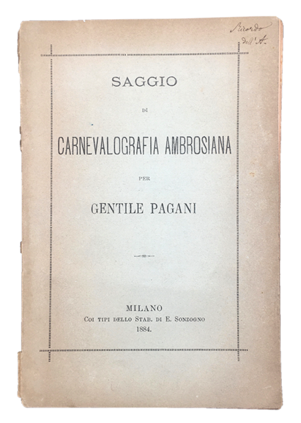 Saggio di CARNEVALOGRAFIA AMBROSIANA. In cop., INVIO AUTOGRAFO non firmato dell'Autore.