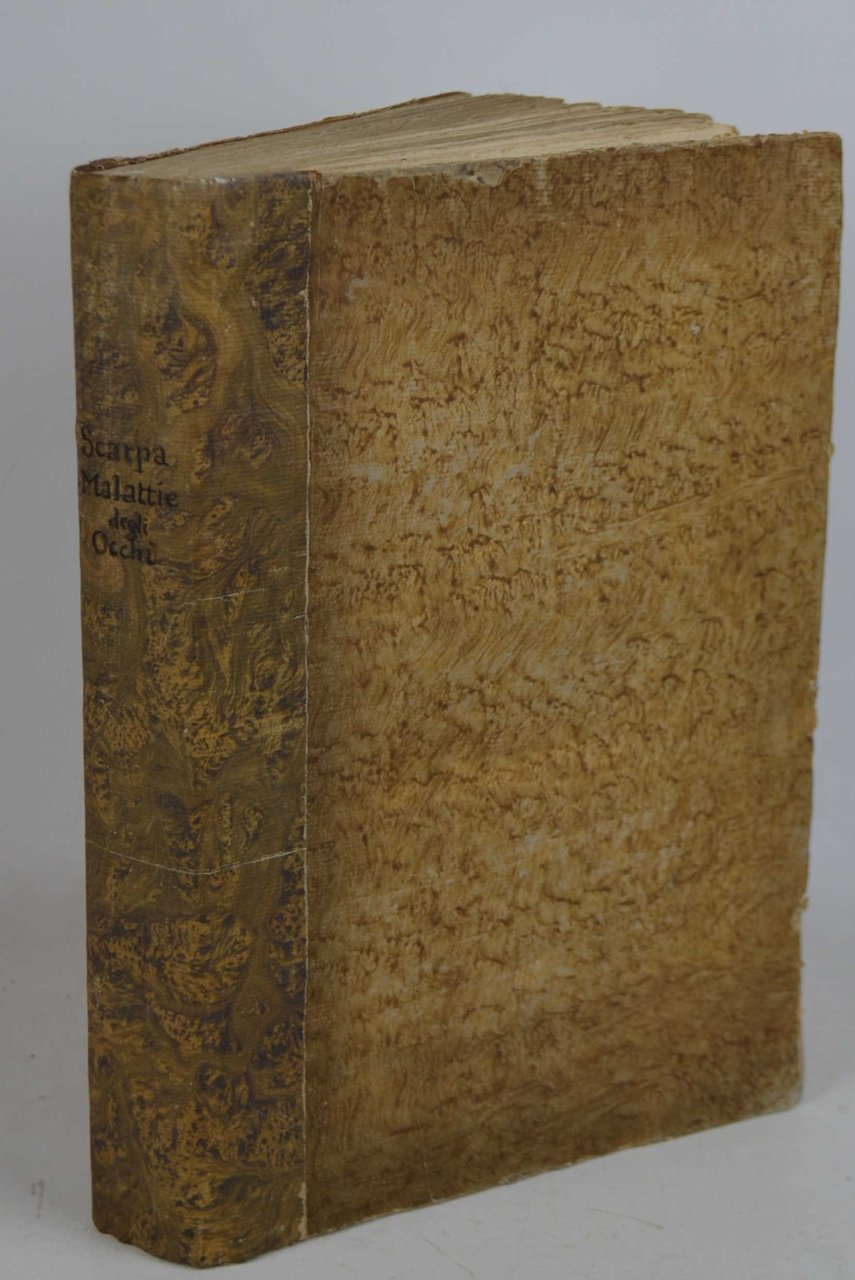 Cm. 31, pp. xi (1) 278 (2). Ritratto inciso dell’autore a piena su una tavola f.t. e 3 tavole ripiegate fuori testo disegnate dello stesso Scarpa ed incise da Faustino Anderloni. Legatura coeva in cart. marmorizzato con dorso ricoperto (posteriormente?) in carta e titolo manoscritto. Esemplare marginoso, stampato su carta forte e ben conservato. Prima rara edizione del primo trattato italiano di oftalmologia. Cfr. Garrison and Morton: "The author has been called the father of Italian ophthalmology".