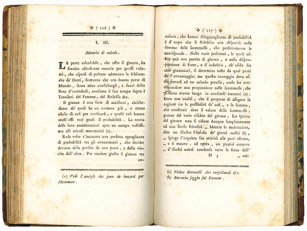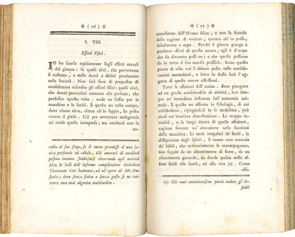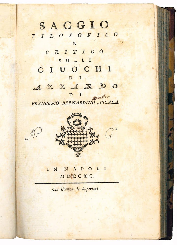 “Nel 1790, a venticinque anni, il salentino Francesco Bernardino Cicala dette alle stampe a Napoli un'opera riecheggiante nel titolo un lavoro di P.R. Montmort [Essai d'analyses sure les jeux de hazard, Paris, 1708], cioè il Saggio filosofico e critico sulli giuochi di azzardo, come emblematico segno di un rilevato illuministico interesse per i problemi del vivere civile nella capitale del Regno meridionale: non solo esame di operazioni algebrico-matematiche, ma una serie di approfondimenti e definizioni del gioco d'azzardo, per interpretarlo e valutarlo nell'ambito dell'agire umano e nel divenire storico […] L'autore non nascondeva l'autobiografica compromissione, per aver conosciuto e frequentato i tavoli da gioco, rimanendo coinvolto nella passione per il gioco d'azzardo. L'esperienza personale si decantava però nella riflessione e diveniva patrimonio da rendere pubblico, come oggetto di esame e di attenta analisi. L'indagine su di sé si allargava ai gruppi, ai ceti, alla nazione. Perciò il gioco d'azzardo era indagato non solo come fatto individuale, ma come dimensione collettiva, nel suo progressivo estendersi dai singoli individui ai diversi ceti sociali. La diffusione del gioco d'azzardo era ormai un problema ‘politico', oggetto di disamina e di dibattito per un letterato civilmente impegnato. Il Saggio, dunque, opera nella consapevolezza che la problematica del gioco d'azzardo possa essere ascrivibile ad una specifica trattatistica – di articolata strutturazione letteraria – nell'ambito del canone illuministico-razionalistico, non riferito quindi soltanto a forme di narrativa o di esercizio lirico, ma allargato anche a forme letterarie variegate, comunque ascrivibili nella dimensione delle ‘pubblica armonia'. In forza di ciò, la struttura del Saggio si compone di due Sezioni; nella prima i capitoli I – Sensibilità umana, II – La passione del gioco, III – Effetti morali, IV – Conseguenze, V – Abiti viziosi, VI – Apostrofe al bel sesso, VII – Il tempo, suo uso ed abuso, VIII – Effetti fisici. Nella seconda sezione seguono altri otto capitoli, in successione, Origine, Oggetto di dispute, Materia di calcolo, Mire politiche, Teoria di giustizia, Legislazioni, Diritto di proscrizione, Linguet all'esame […] [Oltre a quelle classiche e teologiche,] le citazioni dagli autori d'Oltralpe risultano particolarmente numerose: J. De la Bruyère, F. de la Rochefoucauld, i giusnaturalisti H. Grotius, Cl.-A. Helvetius, S. Pufendorf, sino a Ch.-L. Montesquieu, D. Diderot, F.-M. Voltaire e J.J. Rousseau, P.L. Maupertuis e É. Condillac e gli inglesi J. Locke e W. Balckstone. Significativi sono i riferimenti agli illuministi napoletani, A. Genovesi e G. Filangieri e al milanese Cesare Beccaria, ricordato per il suo Saggio sul Faraone, articolo di riflessione sul gioco d'azzardo detto ‘Faraone', pubblicato nel Caffè; similmente significative, due citazioni rinviano a Luigi Galvani e Alessandro Volta per la tematica dell'elettricità […] Nella descrizione degli effetti fisici, il Cicala utilizza con sicurezza le conoscenze organico-fisiologiche di tessuti, strutture e sistemi dell'organismo umano, per raggiungere una notevole efficacia di rappresentazione […] Le riflessioni e gli approfon