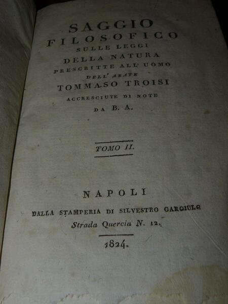 Due volumi in 8°, pp. XXXIII, 246, 415, legature in mezza pergamena con titoli in oro su tasselli. Tagli a spruzzo. Ai frontespizi è stata asportata una strisciolina nel lato inferiore senza alcuna perdita di dati, la pagina 149 del primo volume presenta una mancanza all'angolo inf. destro con parziale perdita di testo. Tommaso Troisi, nato a Lapio nel 1755. Insigne teologo e filosofo divenne professore presso l'Università agli studi di Napoli dove insegnò logica e metafisica. Nel 1796 pubblicò 'Le istituzioni metafisiche', opera notevole per coerenza tomistica e per alcuni spunti originali del pensiero che la proiettano al di là del semplice valore scolastico. Morì a Napoli.