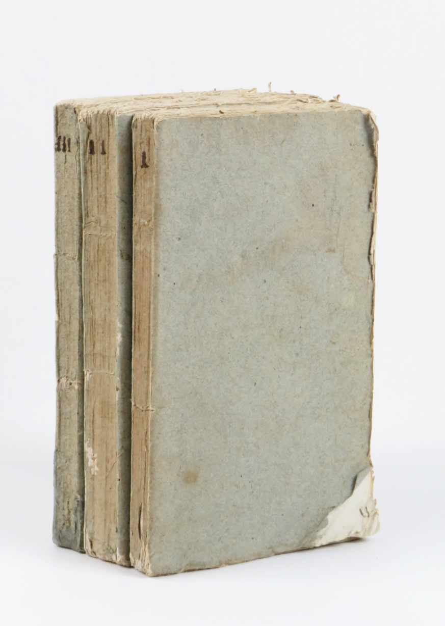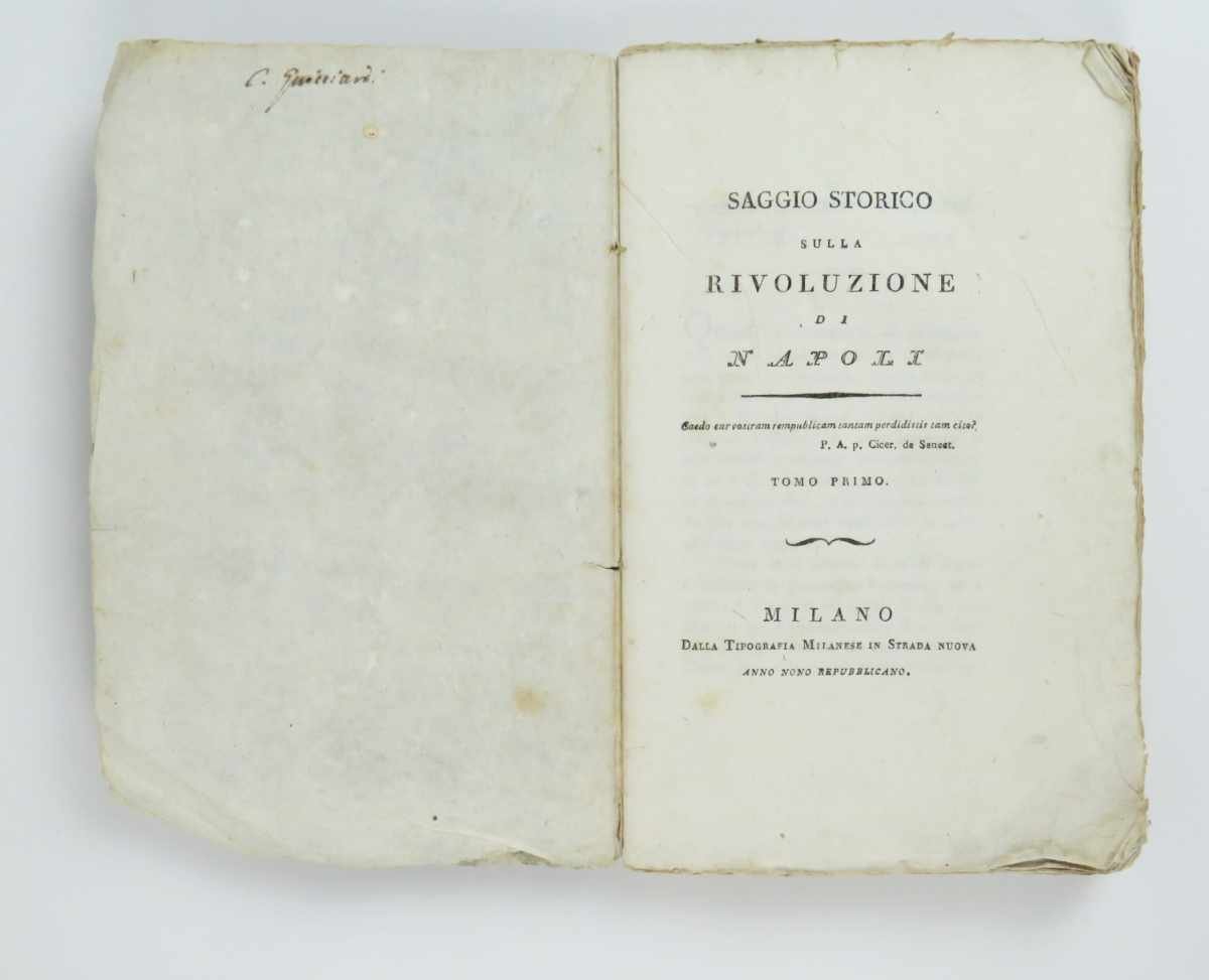 LIBROEdizione originale.Bellissimo esemplare a pieni margini con barbe, nella sua brossura muta d’attesa; interno freschissimo e pulito. L’esemplare sopravanza di oltre due centimetri in altezza (e oltre uno in larghezza) quello della raccolta Parenti. Preziosa firma d’appartenenza ottocentesca al primo risguardo di ciascun volume: «C. Guicciardi». Il Conte Diego Guicciardi (1756-1837), valtellinese, ministro di polizia e segretario di stato durante la Repubblica Cisalpina. All’uscita dell’opera presiedeva la Consulta di Stato. Dopo la restaurazione il Guicciardi, in origine più estremista del Melzi, mediò con il governo austriaco, e con la nascita della Cariplo (1823, allora «Cassa di Risparmio di Milano») fu il primo presidente della banca.«Di estrema rarità», cfr: Parenti Rarità, vol. VI, pp. 345-53. Il Cuoco partecipò attivamente alle vicende della Repubblica Napoletana, incarcerato per alcuni mesi, esiliato con la confisca dei beni. Il «saggio storico» uscì anonimo in questa prima stampa, finanziata da un privato benefattore; ma ebbe immediato successo, affrontando con taglio innovativo il tema della «rivoluzione» nella storia dei popoli e nella sua struttura. Vincenzo Cuoco (1770-1823) si era formato sui testi di Machiavelli, poi studiando a fondo l’intera opera del Vico, con l’ambizioso progetto di giungere ad una vera e propria edizione critica; ma il lavoro preparatorio, assai corposo, andò perso durante l’incarcerazione. L’originalità del Cuoco consiste proprio in una sorta di trapianto dello spiritualismo storico vichiano nell’esperienza delle repubbliche italiane sorte dopo la rivoluzione francese; e in questo si guadagnò l’ammirazione del giovane Manzoni negli anni milanesi (cfr. G. Gentile, Vincenzo Cuoco, Roma, 1924). L’autore fu collaboratore del Murat dopo il rientro a Napoli, ricoprendo anche importanti cariche istituzionali; il ritorno dei Borboni coincise con la malattia mentale dei suoi ultimi anni. Questo saggio è il trattato di filosofia della storia più profondo e importante pubblicato in Italia nel XIX secolo, tra i più significativi del pensiero europeo; certamente non è riducibile a una qualche ala di correnti giacobine o moderate, tanto che, ad esempio, il concetto di «rivoluzione passiva» compare più volte nelle riflessioni di Gramsci. Il suo esame è spietato, vichiano e machiavellico insieme. «Ecco tutto il segreto delle rivoluzioni: conoscere tutto ciò che il popolo vuole, e farlo; egli allora vi seguirà. Distinguere ciò che vuole il popolo da ciò che vorreste voi, ed arrestarvi tosto che il popolo più non vuole; egli allora vi abbandonerebbe» (capitolo XVII). Un classico, senza dubbio.Bibl.: Nicolini, Nota all’edizione del Saggio storico, Laterza, 1913, p. 360, III; Melzi, Opere anonime e pseudonime, III p. 15; Parenti, Rarità, vol. VI, pp. 345-53
