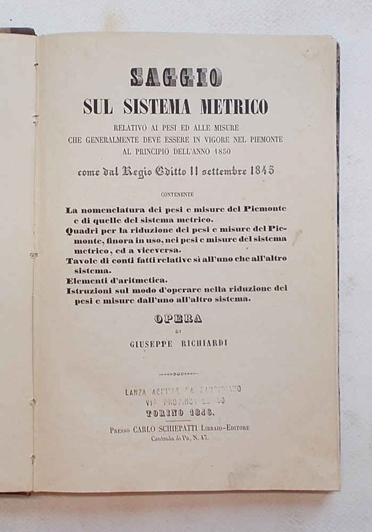 Saggio sul sistema metrico relativo ai pesi ed alle misure che generalmente deve essere in vigore nel Piemonte al principio dell'anno 1850 come dal Regio Editto 11 settembre 1845.