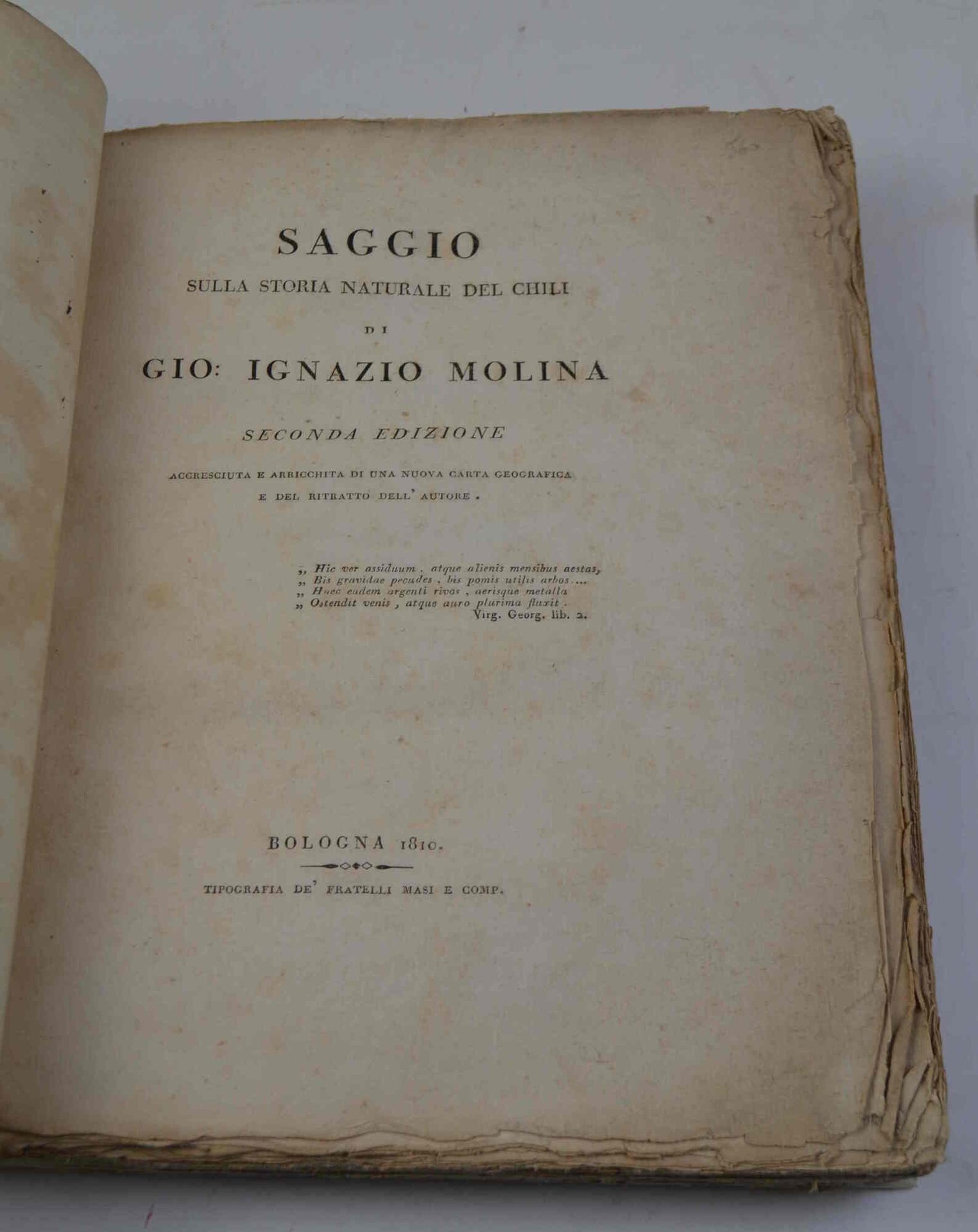 Cm. 31, pp. (6) v (1) 306 + (2) d'errata. Con un bellisimo ritratto dell'autore (Rosaspina inc.) ed una carta geografica ripiegata incisa e ripiegata fuori testo. Leg. in cart. originale. Dorso rifatto in carta con titoli su tassello. Esemplare marginoso e ben conservato, il cui ritratto risulta però più corto di margine ed inerito nel volume. Si tratta della seconda edizione di questo approfondito studio geografico e naturalistico sul Cile, edito in originale nel 1782. Con capitoli sul clima, la fauna, la flora, la lingua del paese sudamericano. Cfr. Sabin 49888.
