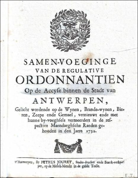 Gebonden, recente oranje linnenband met goudopdruk op de rug, 16.2x21 cm., 130 pp. Ex-libris J. Slootmans. Samen-voeginge van de regulative ordonnantien op de accyse binnen de stadt van Antwerpen, gelicht wordende op de wynen, brande-wynen, bieren, zeepe ende gemael . in den jaere 1732